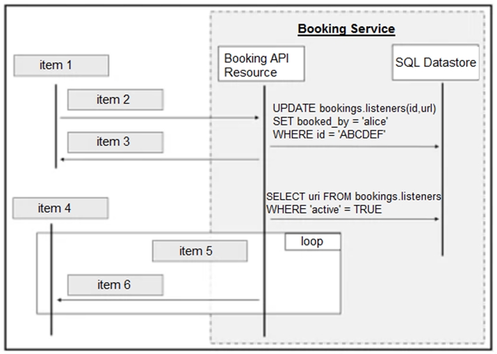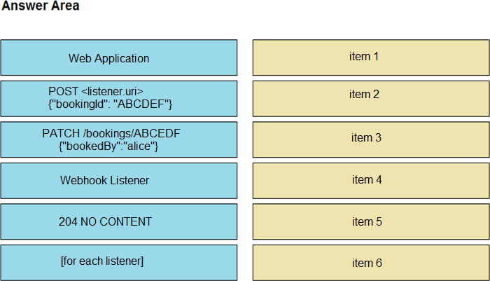 Refer to the exhibit above and click on the tab in the top left corner to view a diagram that describes the typical flow of requests involved when a webhook is created for a booking service. Drag and drop the requests from the left onto the item numbers on the right that match the missing sections in the sequence diagram to design the complete flow of requests involved as a booking is updated from a web application.