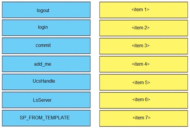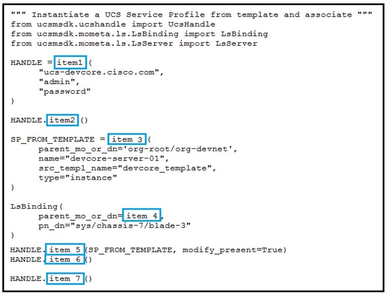 Refer to the exhibit above and click on the resource tabs in the top left corner to view resources to help with this question. Python code that uses the UCS Python SDK is instantiating a service profile named “devcore-server- 01” from service profile template “devcore_template”, then associating the service profile instance to blade 3 in chassis 7. Drag and drop the code snippets from the left onto the item numbers on the right that match the missing sections in the Python exhibit.