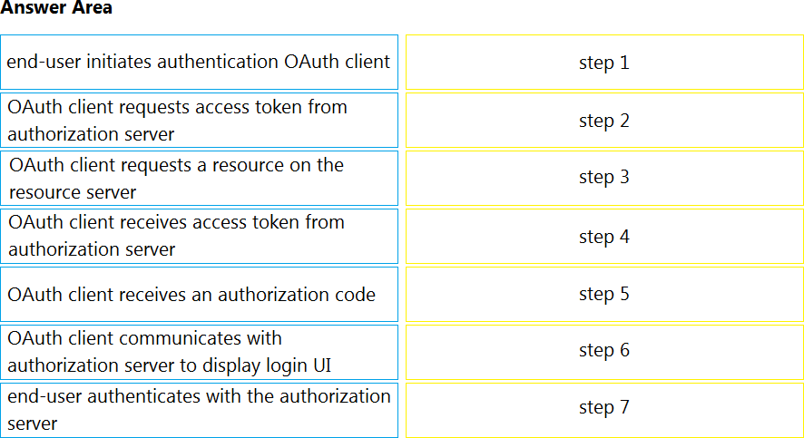 Drag and drop the steps on the left into the order on the right for an end-user to access an OAuth2 protectedresource using the 'Authorization Code Grant' flow.