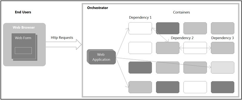 Refer to the exhibit. The application follows a containerized microservices architecture that has one container per microservice. The microservices communicate with each other by using REST APIs. The double-headed arrows in the diagram display chains of synchronous HTTP calls needed for a single user request.