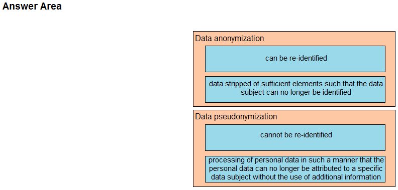 Drag and drop the characteristics from the left onto the correct data processing techniques on the right, in the context of GDPR.