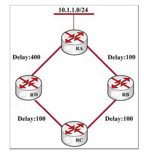 In this network presented in the following exhibit, all routers are configured to perform EIGRP on all interfaces. All interface bandwidths are set to 1000, and the delays are configured as displayed. In the topology table at router P4S-RC, only one path can be seen towards 10.1.1.0/24. Which description is correct?