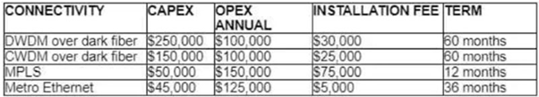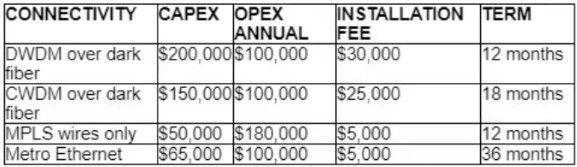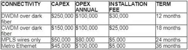 The hint is the requirement 'option to scale for up to 20 resilient connections in the second year'. this effectively multiplies the estimated cost with 20 times.