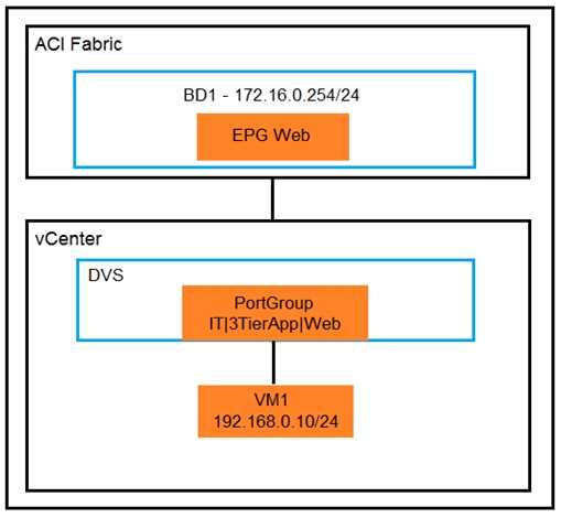 An organization migrates its virtualized servers from a legacy environment to Cisco ACI. VM1 is incorrectly attached to PortGroup IT|3TierApp|Web.