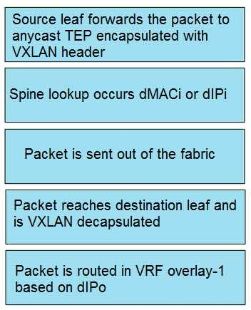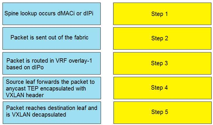 A leaf receives unicast traffic that is destined to an unknown source, and spine proxy is enabled in the corresponding bridge domain. Drag and drop the Cisco ACI forwarding operations from the left into the order the operation occurs on the right.