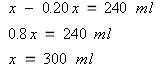 The original volume of water, x, minus 20% of x, 0.20x, is equal to the current volume of water, 240ml: