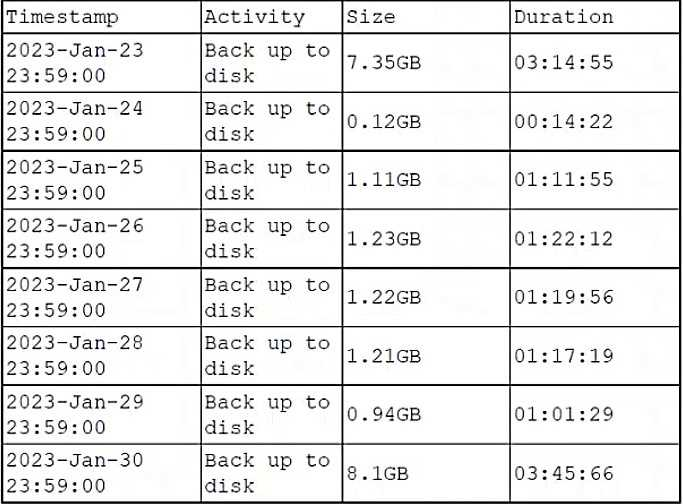 A DBA is reviewing the following logs to determine the current data backup plan for a primary data server: