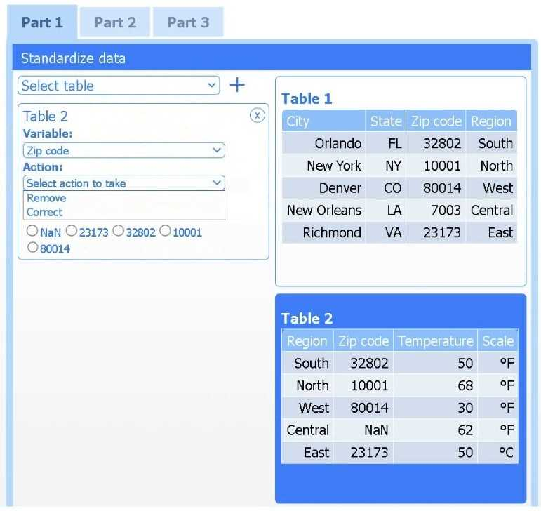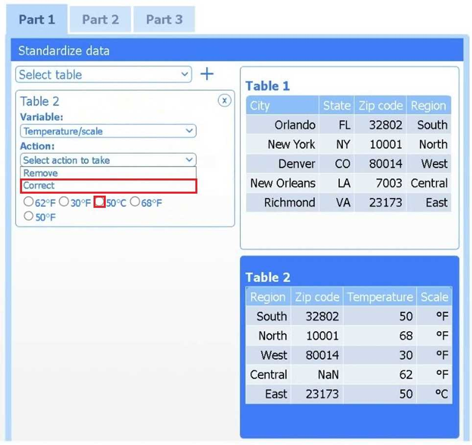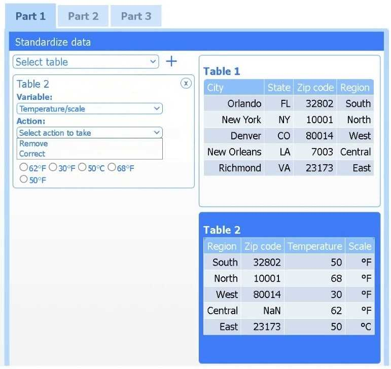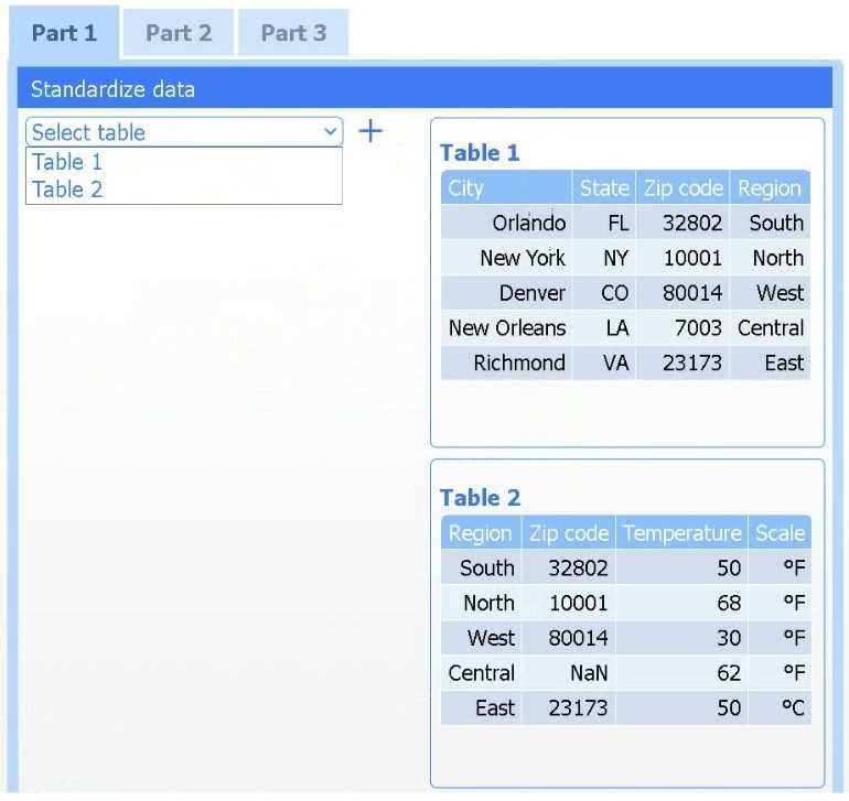 Select Table 2. Table 2 contains mixed temperature scales (°F and °C) that must be standardized before visualization.