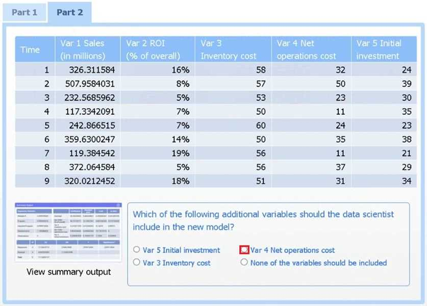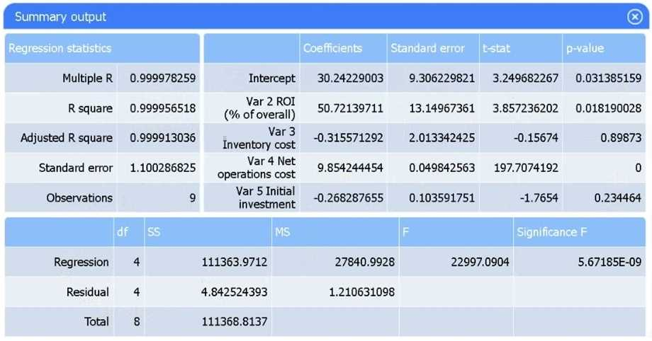 Net operations cost has a p-value of essentially 0 (far below 0.05), indicating it is the only additional predictor statistically significant in explaining sales. Neither inventory cost (p0.90) nor initial investment (p0.23) reach significance.