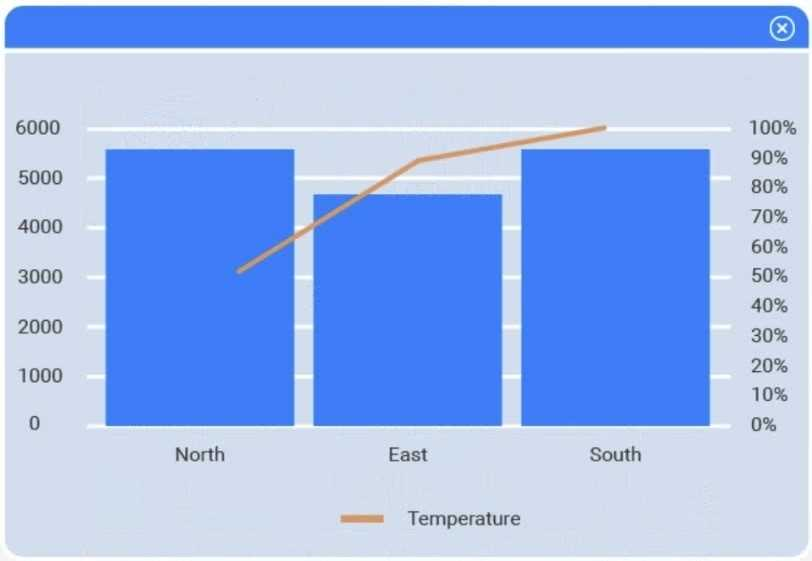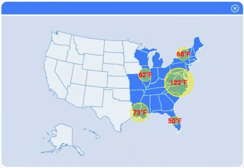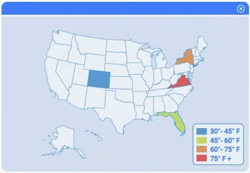 A choropleth map best shows geographic variation in temperature by coloring each state (or region) according to its recorded value. This lets the client immediately see where the highest and lowest temperatures occur across the U.S. without distracting elements like bubble size or combined chart axes.