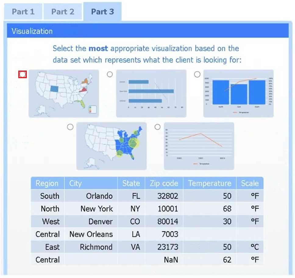 Select the most appropriate visualization based on the data set that represents what the client is looking for.