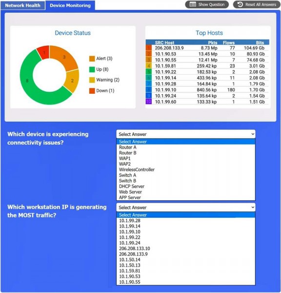 Click on each tab at the top of the screen. Select a widget to view information, then use the drop-down menus to answer the associated questions.
