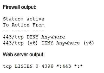 A systems administrator receives reports about connection issues to a secure web server. Given the following firewall and web server outputs: