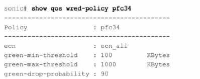 The output of the command show qos wred-policy pfc34 shows the ECN (Explicit Congestion Notification) configuration for the policy pfc34. The line ecn: ecn_all indicates that ECN is enabled for all traffic classes (all DSCP values). Additionally, the green-min-threshold, green-max-threshold, and green-drop-probability settings are shown, but there is no indication of a 10% probability for marking traffic as congested. Therefore, the correct answer is B.