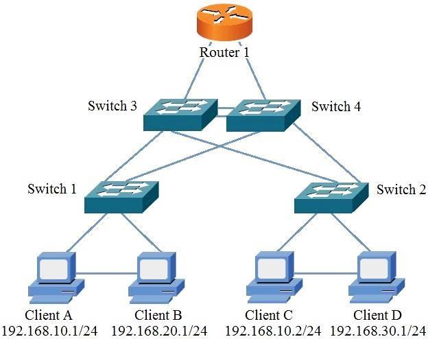 If Client B sends a packet to Client A, what is the highest level of the network hierarchy that the packet will transverse?