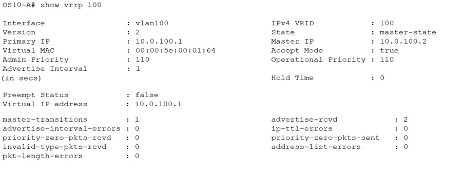 What is the VRRP state of OS10-A after a router with a default VRRP admin priority with VRID100 comes online?