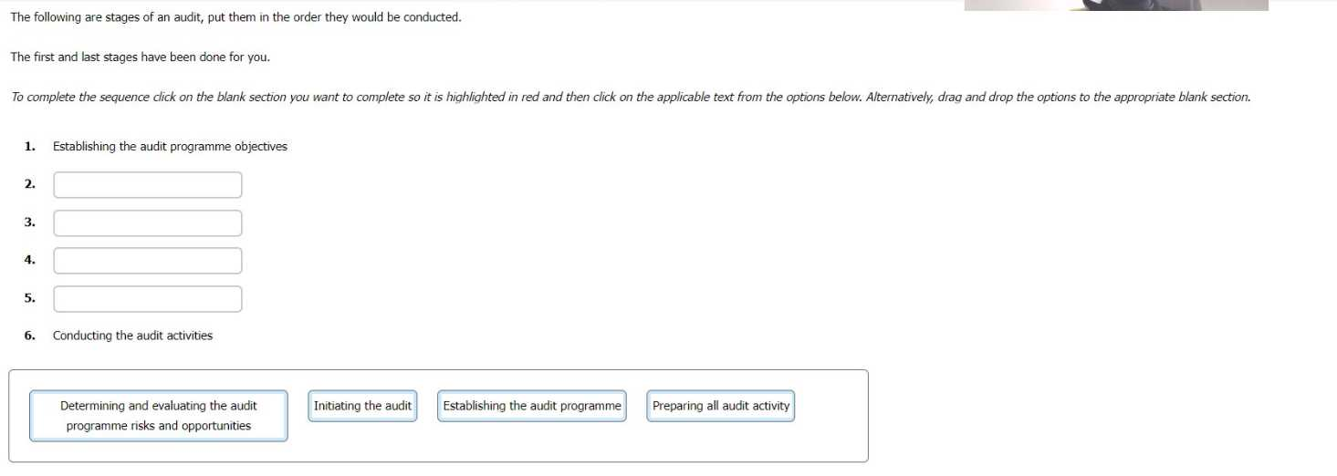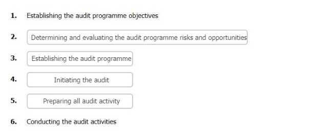 Establishing the audit programme: This is the third stage of the audit process, where the audit programme is designed and implemented. The audit programme should include the audit programme procedures, the audit programme resources, the audit methods and techniques, the audit frequency and schedule, and the audit programme performance indicators12. Initiating the audit: This is the fourth stage of the audit process, where the audit is prepared and planned. The audit initiation involves selecting the audit team, establishing the contact with the auditee, defining the audit objectives, scope, and criteria, developing the audit plan, and conducting the document review123.