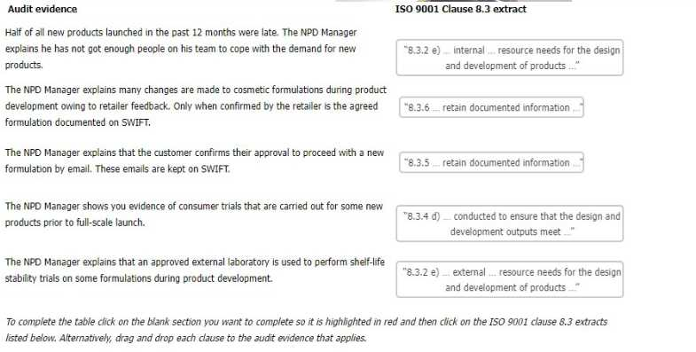 You have gathered audit evidence as outlined in the table. Match the ISO 9001 clause 8.3 extracts to the audit evidence.
