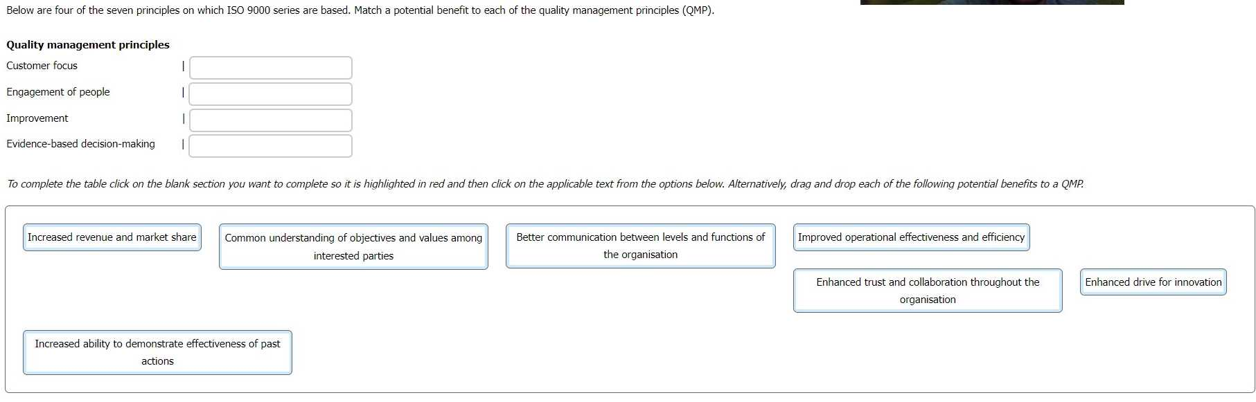 Below are four of the seven principles on which ISO 9000 series are based. Match a potential benefit to each of the quality management principles (QMP).