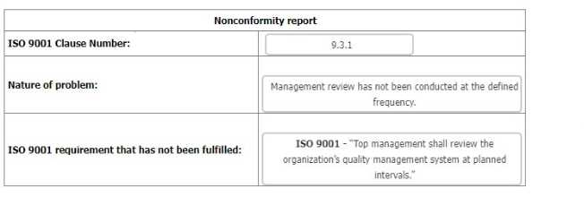 ISO 9001 Clause Number: 9.3.1 Nature of problem: Management review has not been conducted at the defined frequency. ISO 9001 requirement that has not been fulfilled: ISO 9001 - "Top management shall review the organization's quality management system at planned intervals." Evidence: The last management review took place nine months ago, and the previous one took place one year before the latest review. The planned interval is six months.