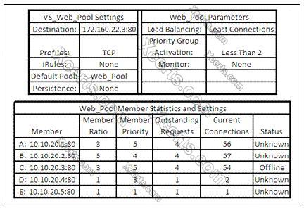 The incoming client IP address is 205.12.45.52. The last five connections have been sent to members C, D, A, B, B. The incoming client. IP address is 205.12.45.52. The last five connections have been sent to members C, D, A, B, B. Given the virtual server and pool definitions and the statistics shown in the graphic, which member will be used for the next connection.