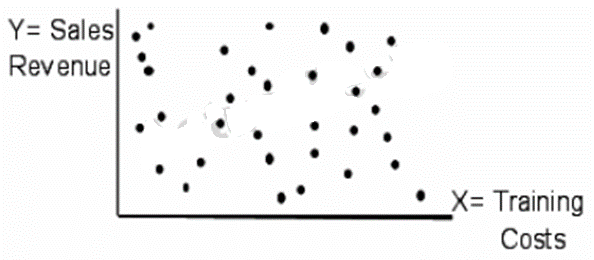 When the points have a systematic relationship, the independent (x) variable and dependent (y) variable are likely to be correlated; i.e.. the value of one variable is a predictor of the value of the other. However, the variables in this scatter gram are clearly uncorrelated because training costs do not predict sales.