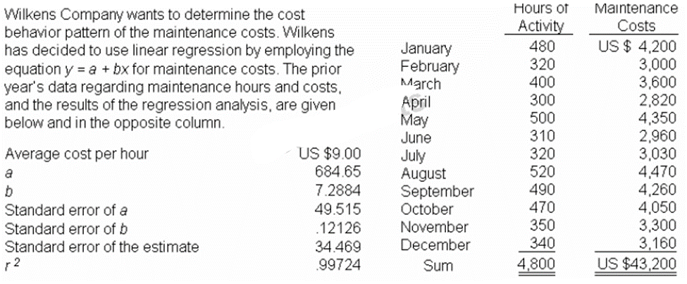 Based upon the data derived from the regression analysis, 420 maintenance hours in a month would mean the maintenance costs (rounded to the nearest US dollar) would be budgeted at: