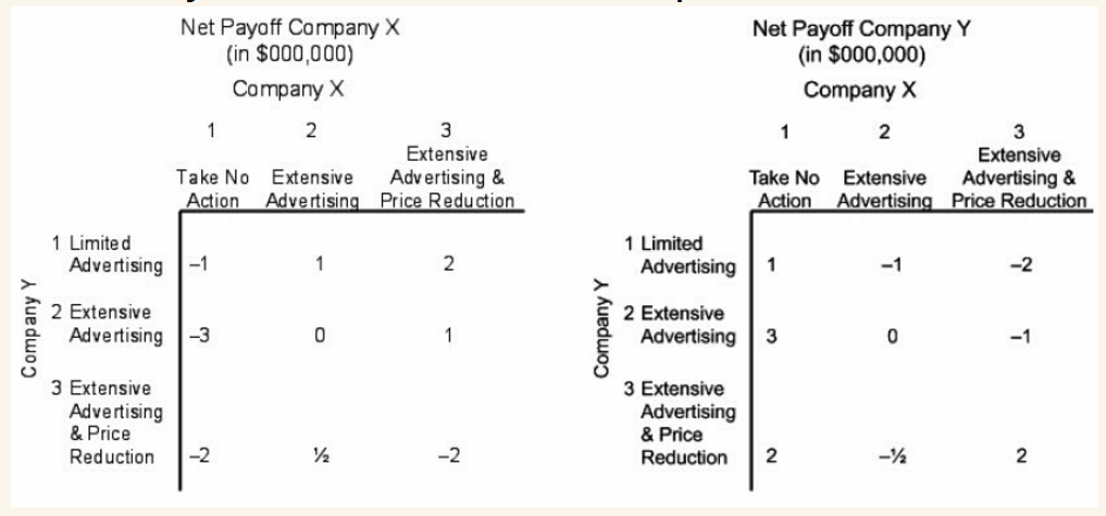 Game theory is a mathematical approach to decision making when confronted with an enemy or competitor. Games are classified according to the number of players and the algebraic sum of the payoffs. In a two-player game, if the payoff is given by the loser to the winner, the algebraic sum is zero, and the game is a zero-sum game; if it is possible for both players to profit, the game is a positive-sum game. In this situation, the sum of the payoffs for each combination of strategies is zero. For example, if X takes no action and Y chooses limited advertising, X's payoff is -1 and Ys is 1.