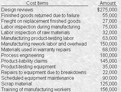 Listed below are costs of quality that a manufacturing company has incurred throughout its operations.