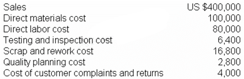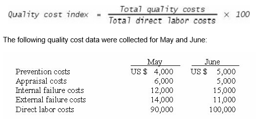 The total cost of quality equals the sum of prevention costs (quality planning), appraisal costs (inspection and testing), internal failure costs (scrap and rework), and external failure costs (customer complaints and returns), or US $30,000 ($2,800 + $6,400 + $16,800 + $4,000). Thus, the quality cost index for March is 7.5 [(US $30,000 - US $400,000) x 100].