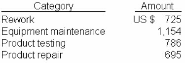 Answer C is correct. Prevention costs are incurred to prevent defects from occurring. An example is equipment maintenance. Appraisal costs are incurred to detect defective output during and after the production process. An example is product testing. Thus, total prevention and appraisal cost for the month equals US $1,940 (US$1,154 + US $786).
