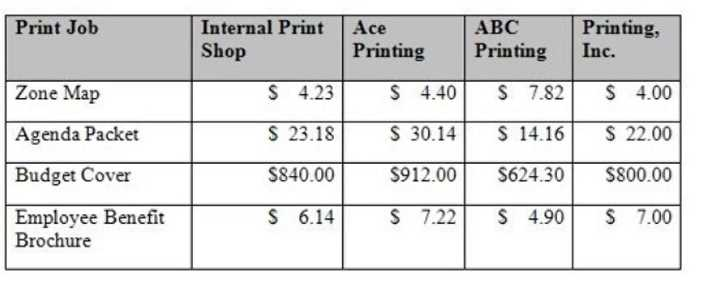 Option C (Outsourcing is necessary): Incorrect, as feasibility doesn't mean necessity; internal printing is still an option if other factors (like quality or control) outweigh costs. Option D (Award contract to ABC Printing): Incorrect, since the best vendor depends on the job (e.g., Printing, Inc. is cheaper for Zone Map and Agenda Packet).