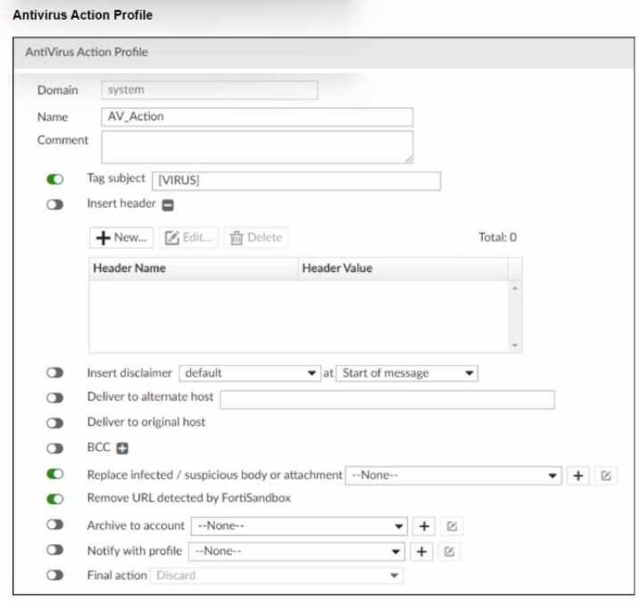 What are two expected outcomes if FortiMail applies this antivirus action profile to an email? (Choose two.)