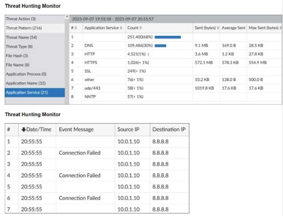 The Threat Hunting Monitor in the provided exhibits shows various application services, their usage counts, and data metrics such as sent bytes, average sent bytes, and maximum sent bytes. The second part of the exhibit lists connection attempts from a specific source IP (10.0.1.10) to a destination IP (8.8.8.8), with repeated "Connection Failed" messages.