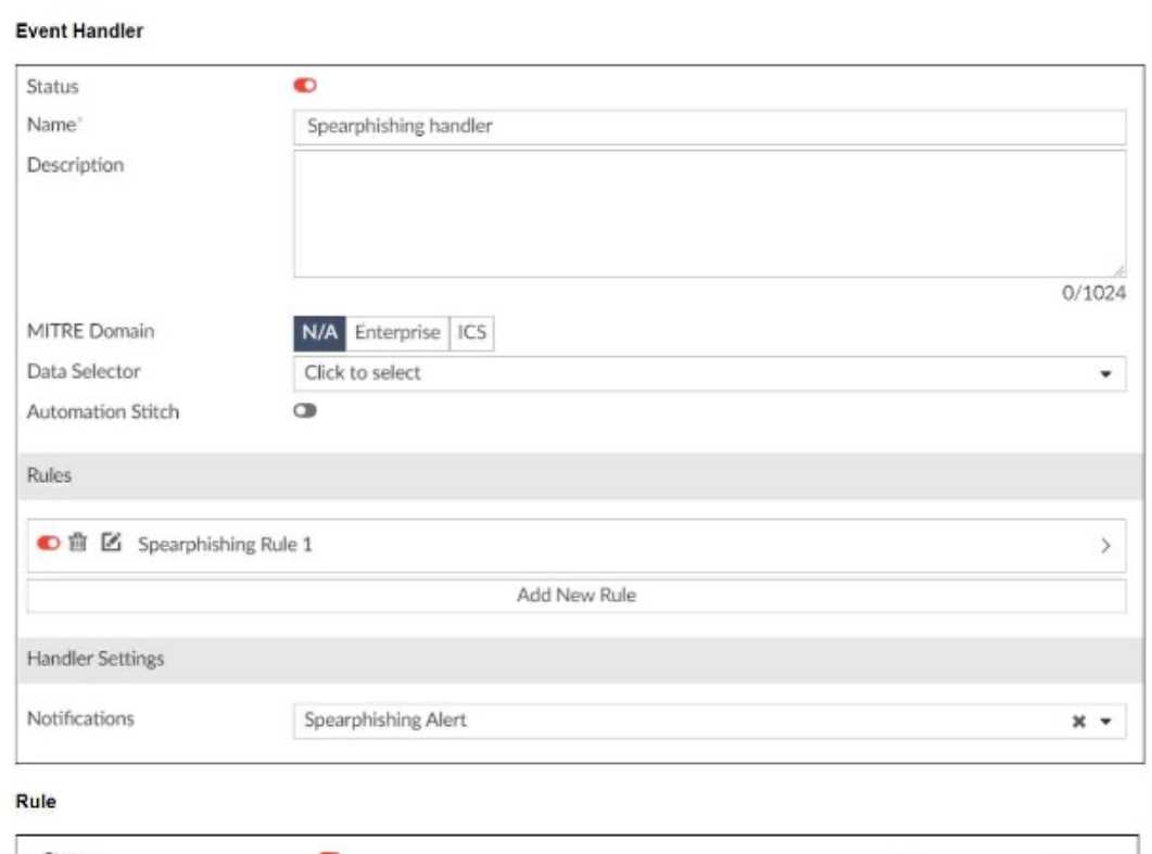 The event handler is set up to detect specific security incidents, such as spearphishing, based on logs forwarded from other Fortinet products like FortiSandbox.