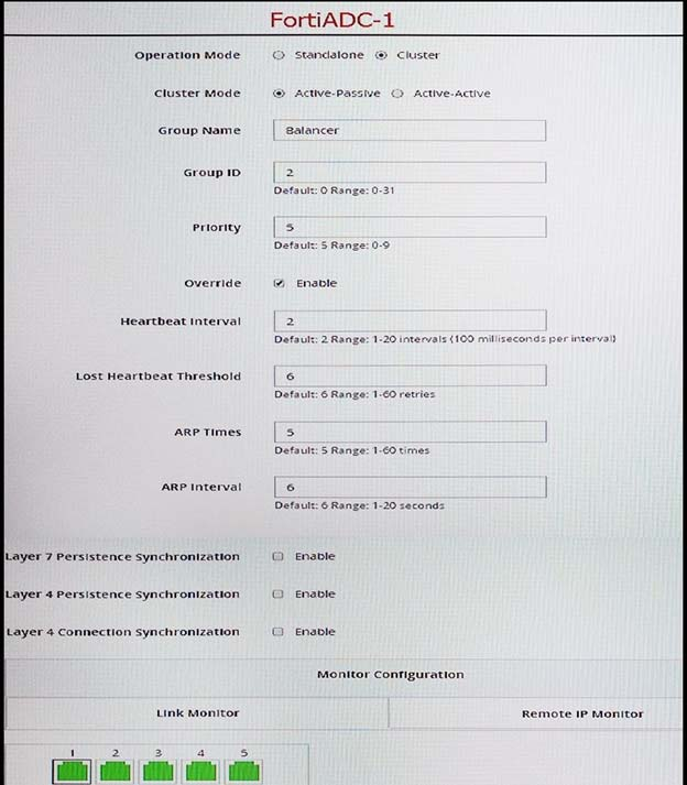 Two FortiADC devices (ADC-1 and ADC-2) form an HA cluster. The following exhibits shows the HA configuration for both FortiADC devices: