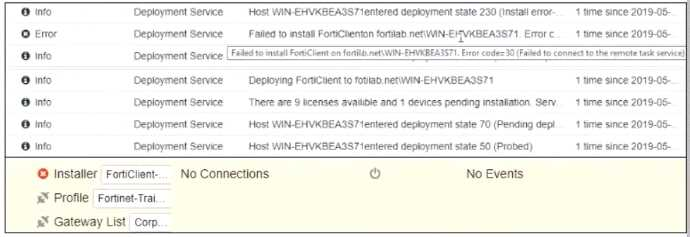 Based on the logs shown in the exhibit, why did FortiClient EMS fail to install FortiClient on the endpoint?