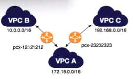 3. TO route packets directly from VPC B to VPC C through VPC A, you must add a route for network 192.168.0.0/16 in the VPC A routing table.