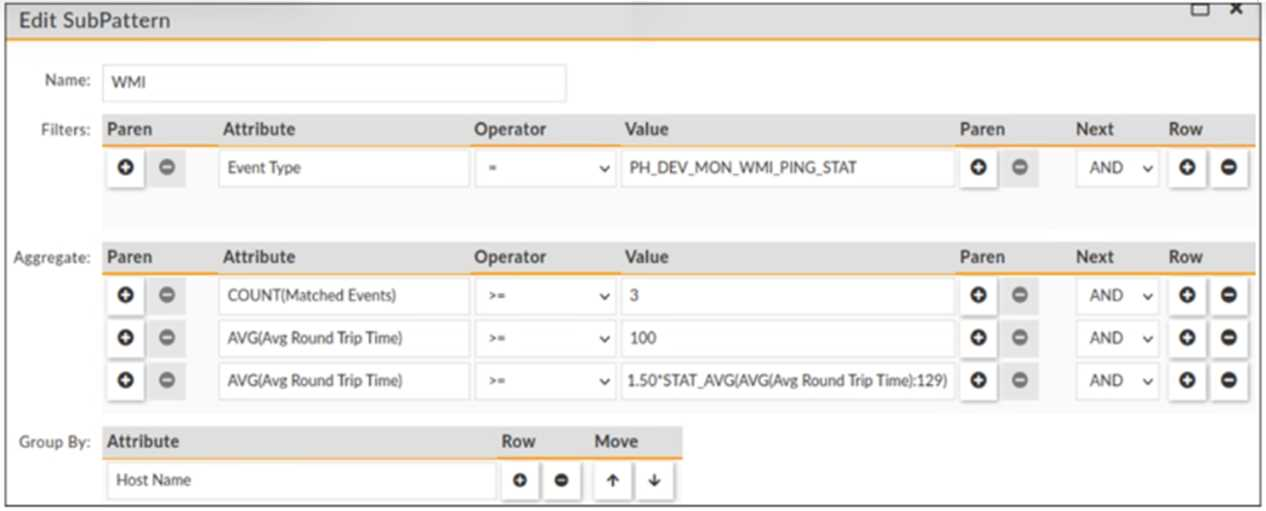 The rule is tracking the WMI response times from Windows devices using a baseline calculation. The rule will trigger an incident if the current WMI response time is greater than or equal to 1.50 times the average WMI response time in the last 30 minutes.