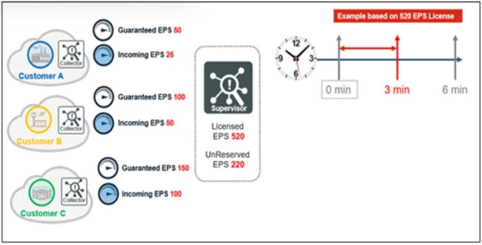 Based on the information provided in the exhibit, calculate the unused events for the next three minutes for a 520 EPS license.
