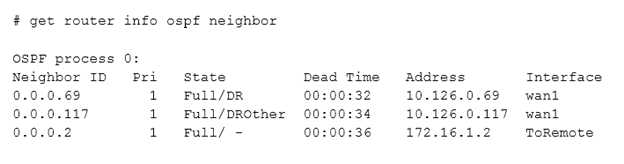 Examine the output of the `get router info ospf neighbor' command shown in the exhibit; then answer the question below.