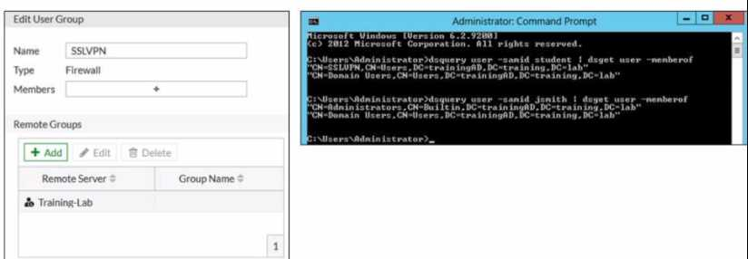 Examine the FortiGate user group configuration and the Windows AD LDAP group membership information shown in the exhibit