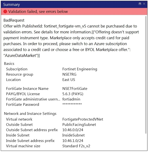 You are deploying a FortiGate-VM in Microsoft Azure using the PAYG/On-demand licensing model. After you configure the FortiGate-VM, the validation process fails, displaying the error shown in the exhibit.