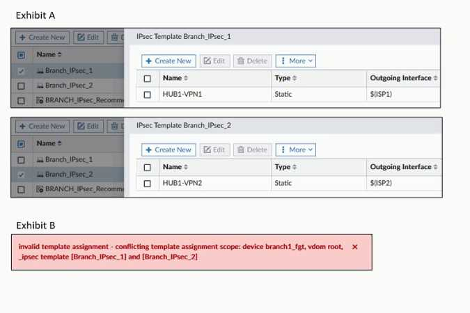 Exhibit A shows two IPsec templates to define Branch_IPsec_1 and Branch_IPsec_2. Each template defines a VPN tunnel.
