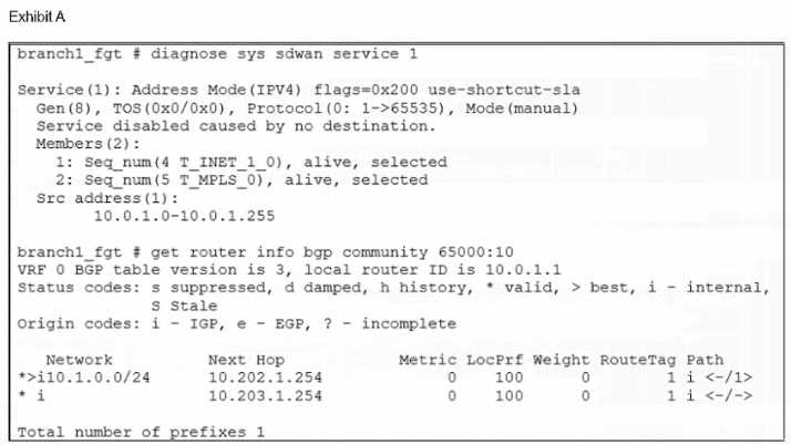 An administrator is testing application steering in SD-WAN. Before generating test traffic, the administrator collected the information shown in exhibit A.