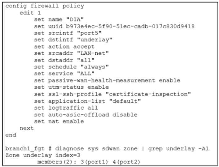 Study Guide 7.2, pages 103 - 104. Another comment said "because without using application Control on the firewall policy, SDWAN can't work" but there is a app control "default" defined on config.