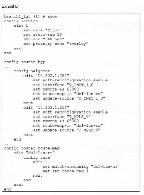 Exhibit B shows the SD-WAN rule configuration, the BGP neighbor configuration, and the route map configuration.