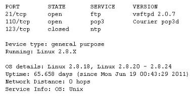 You run nmap port Scan on 10.0.0.5 and attempt to gain banner/server information from services running on ports 21, 110 and 123.