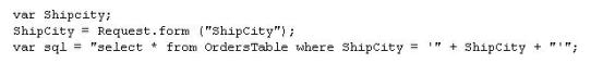 The following script shows a simple SQL injection. The script builds an SQL query by concatenating hard-coded strings together with a string entered by the user:
