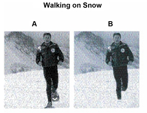 In figure A, the man is walking in snow with snowshoes and does not sink into the deep snow. In figure B, the man has no snowshoes on and immediately sinks into the deep snow.